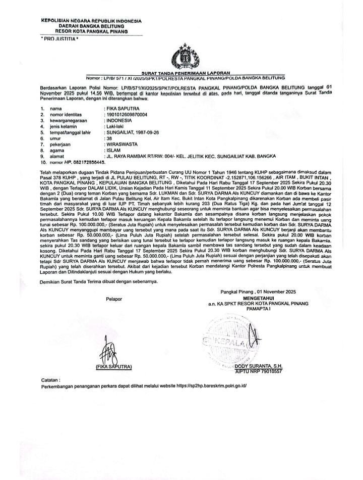 Dok : Surat LP/B/571/XI/2025/SPKT/POLRESTA PANGKAL PINANG/POLDA BABEL, tertanggal 1 November 2025 pukul 14.56 WIB.