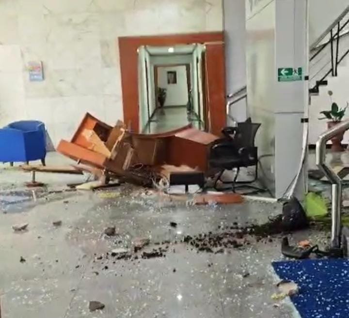 Tidak berhenti di situ, pagar besi di depan kantor pun roboh, diikuti aksi perusakan terhadap bagian lobi utama gedung.
