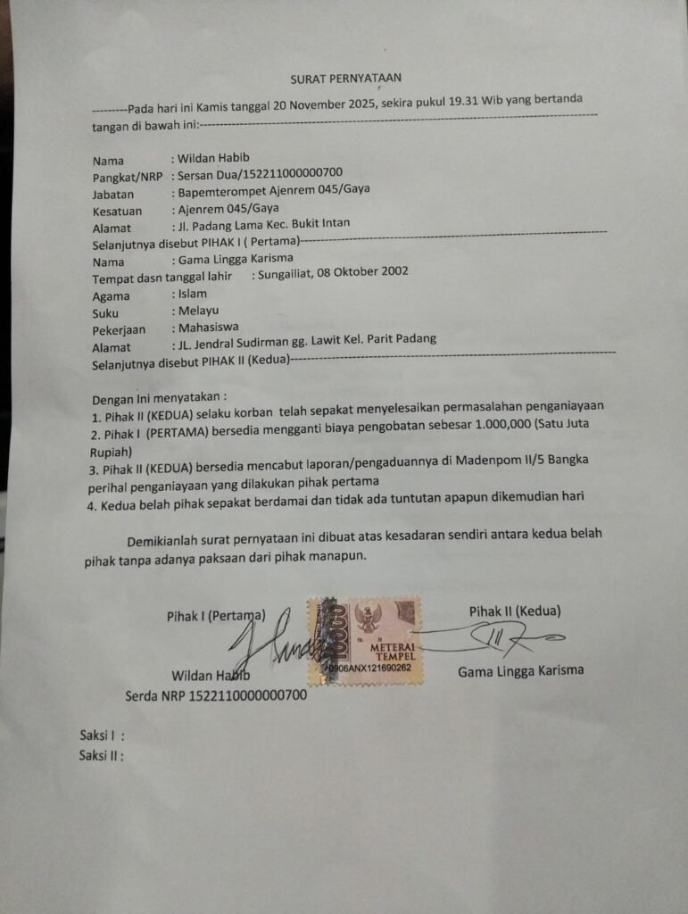 Setelah sempat berproses hingga pelaporan resmi ke Denpom II/5 Bangka, kedua belah pihak kini sepakat menyelesaikan peristiwa yang terjadi pada Selasa (18/11/2025) tersebut secara kekeluargaan.